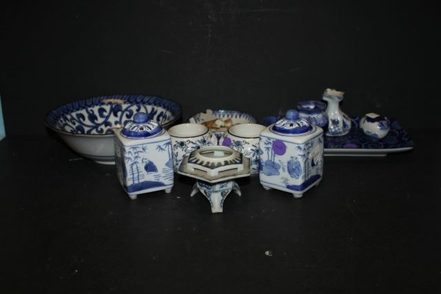 Grouping of Blue and White Porcelain, Tray, Small Jars, and Vases, Bowl 6"dia. Grouping of Blue and White Porcelain, Tray, Small Jars, and Vases, Bowl 6"dia.