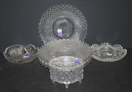 415 Four Press Glass Plates, Two Cut Glass Dishes, and Footed Press Glass Box dishes 6"dia.