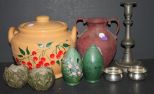 438 Pewter Candlestick, Pewter Salts, Ceramic Vases, and Umberto Glass Vases vases 3"h., glass vases 5"h.