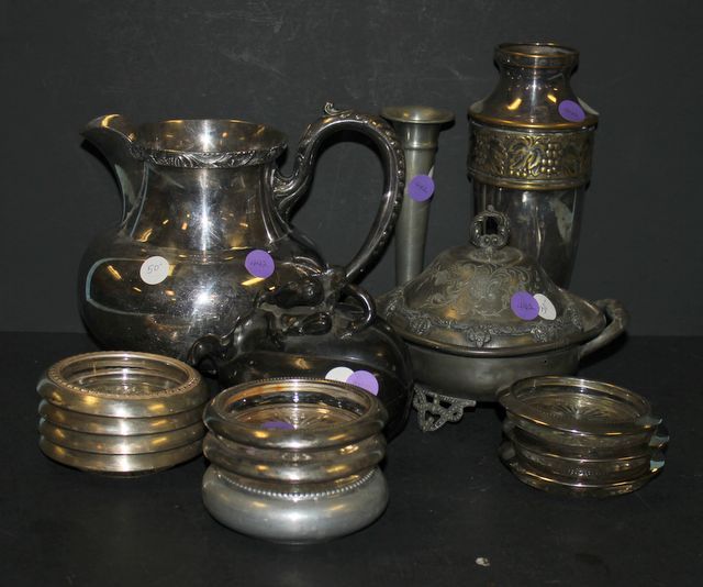 Silverplate Lot coasters, butter dish, pitcher, fruit, and pewter vase. Silverplate Lot coasters, butter dish, pitcher, fruit, and pewter vase.