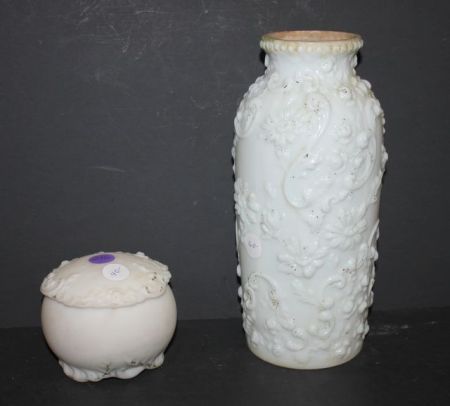 Victorian Painted White Vase and White Round Glass Box Vase 10"h. Victorian Painted White Vase and White Round Glass Box Vase 10"h.