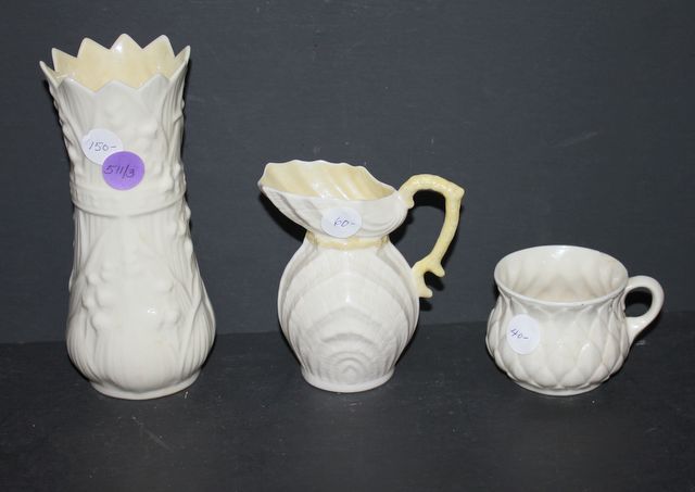 3 Belleek Items Brown mark belleek vase 7"h., black mark belleek cup, and green mark belleek pitcher 4"h. 3 Belleek Items Brown mark belleek vase 7"h., black mark belleek cup, and green mark belleek pitcher 4"h.