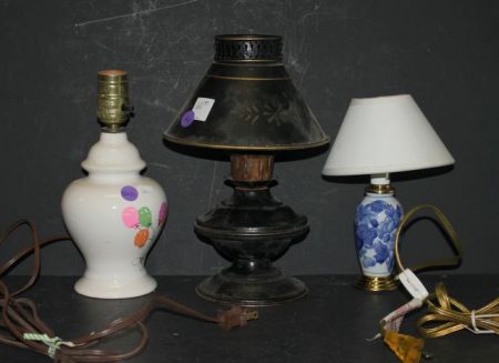 566 Small Porcelain/Brass Lamp, Black Tin Lamp, and Bulbous Lamp tin lamp 9"h.