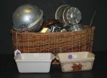 Basket Full of Kitchen Molds and Two Small Ceramic Pans 6"w., 3"H. Basket Full of Kitchen Molds and Two Small Ceramic Pans 6"w., 3"H.