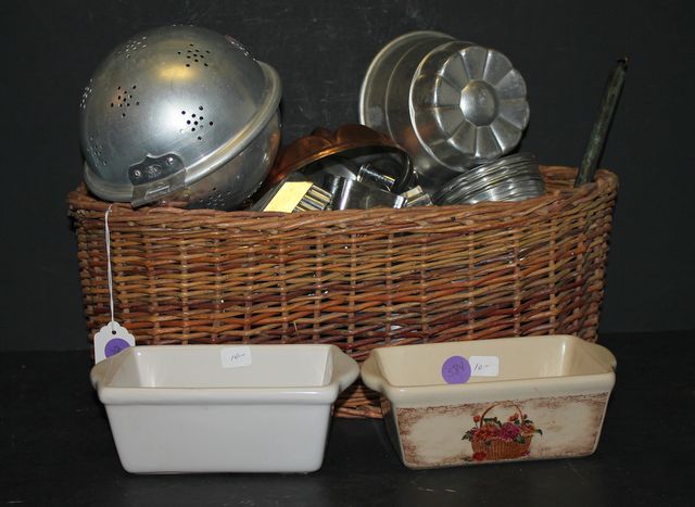 584 Basket Full of Kitchen Molds and Two Small Ceramic Pans 6"w., 3"H.