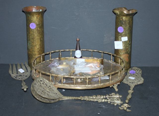 12 pcs Brass tray, 2 vases, 2 large spoons, serving knife, fork, 2 door knockers, and dish 12 pcs Brass tray, 2 vases, 2 large spoons, serving knife, fork, 2 door knockers, and dish
