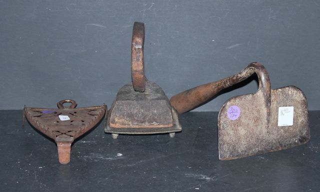 3 Pieces of Cast Iron iron with base, hoe, and another iron base. 3 Pieces of Cast Iron iron with base, hoe, and another iron base.