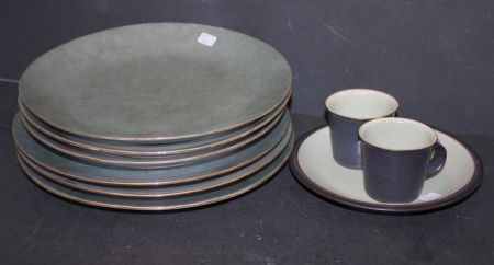 6 Green China Plates, Denby Plates, and 2 Denby Cups 6 Green China Plates, Denby Plates, and 2 Denby Cups