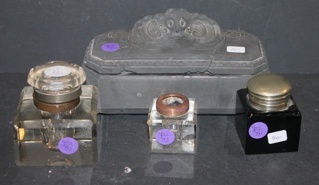 793 4 Ink Wells 3 glass, 1 cracked metal one.