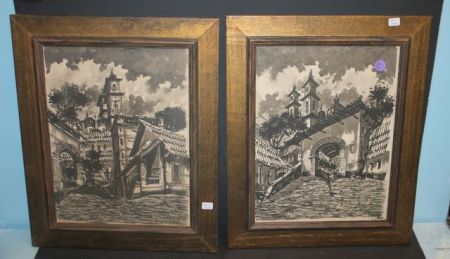 864 Pair of Framed Villa Scenes artist signed, 13 1/2" w., 16 1/2" h.