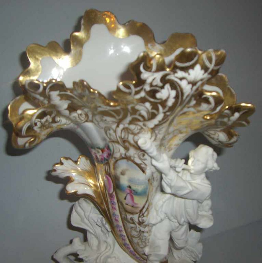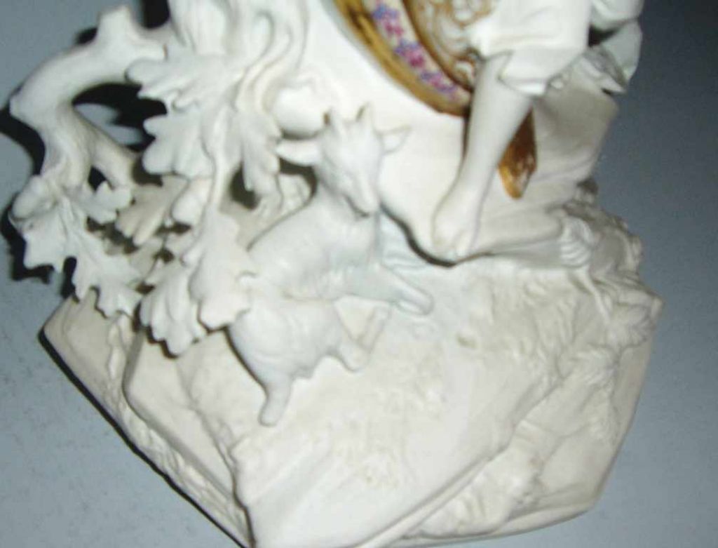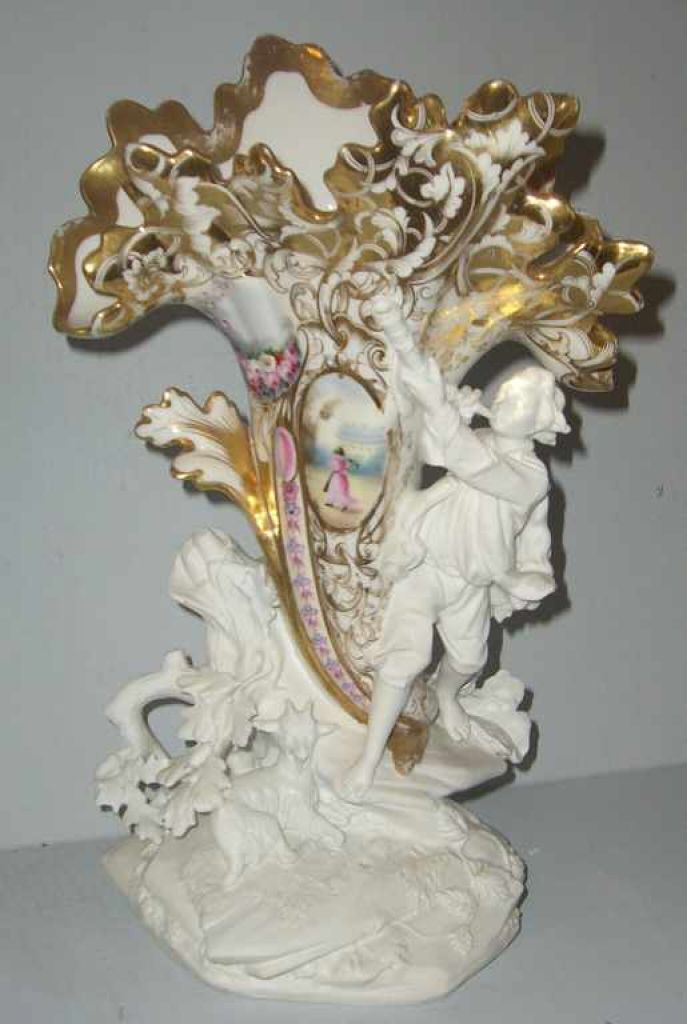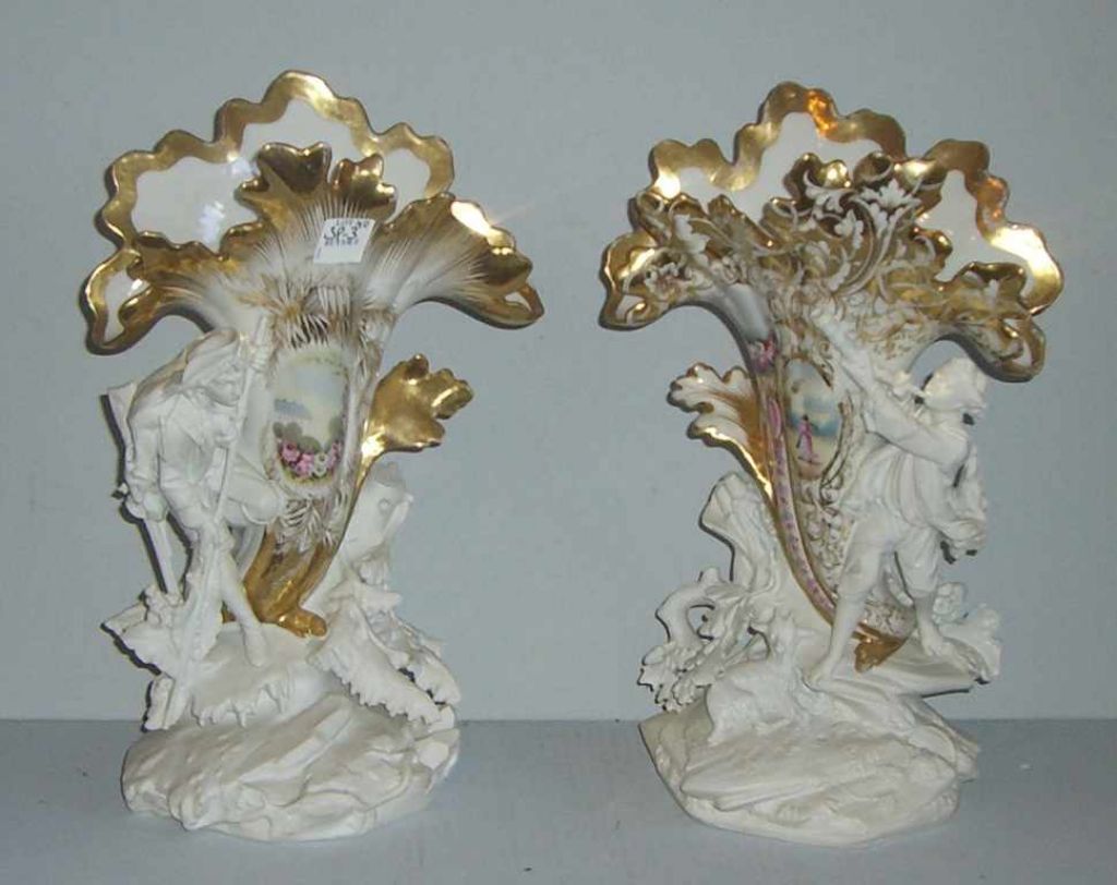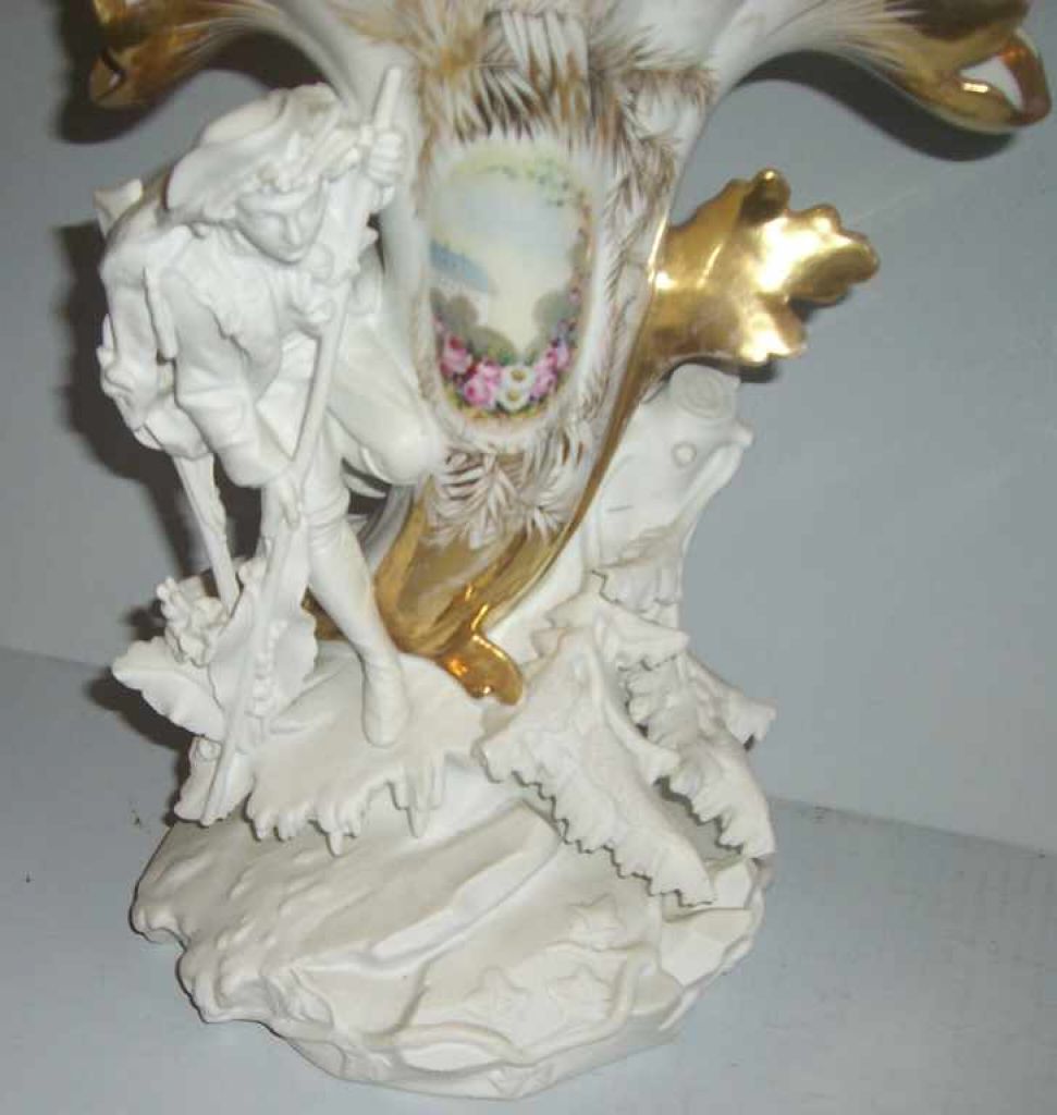 Pair of Old Paris vases gold trimmed. One vase is man with horn and goat and other vase is man with stick and dead deer - 8" tall by 6" deep by 4" wide. MAN WITH STICK VASE HAS PIECE BROKEN ON TOP. ONE ANTLER ON DEER IS BROKEN. Pair of Old Paris vases gold trimmed. One vase is man with horn and goat and other vase is man with stick and dead deer - 8" tall by 6" deep by 4" wide. MAN WITH STICK VASE HAS PIECE BROKEN ON TOP. ONE ANTLER ON DEER IS BROKEN.