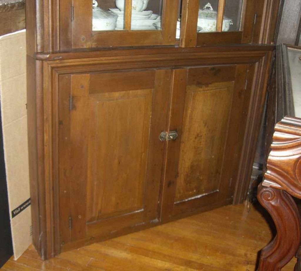 Walnut corner cabinet with 2 upper 8 pane glass doors & 2 raised panel doors in the base, c. 1780 - 84" tall by 25" deep Walnut corner cabinet with 2 upper 8 pane glass doors & 2 raised panel doors in the base, c. 1780 - 84" tall by 25" deep