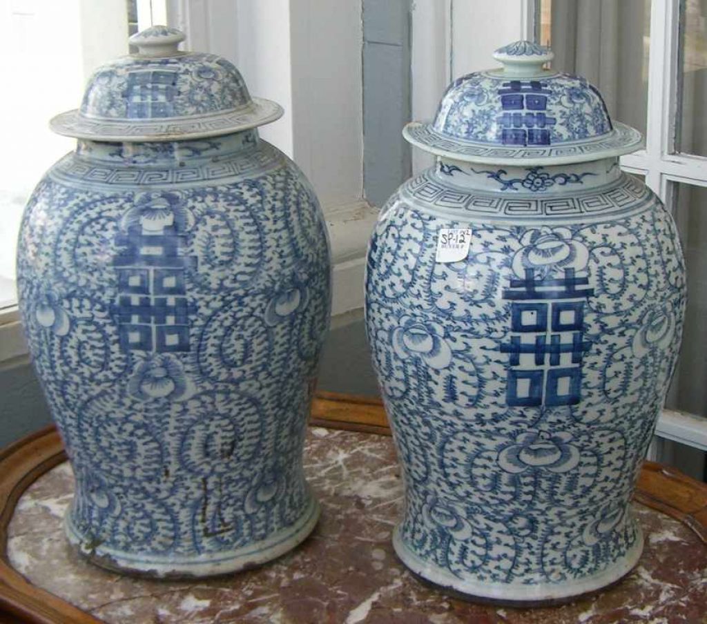 Pair of oriental temple jars with a blue and white design - 10" round by 17" tall Pair of oriental temple jars with a blue and white design - 10" round by 17" tall