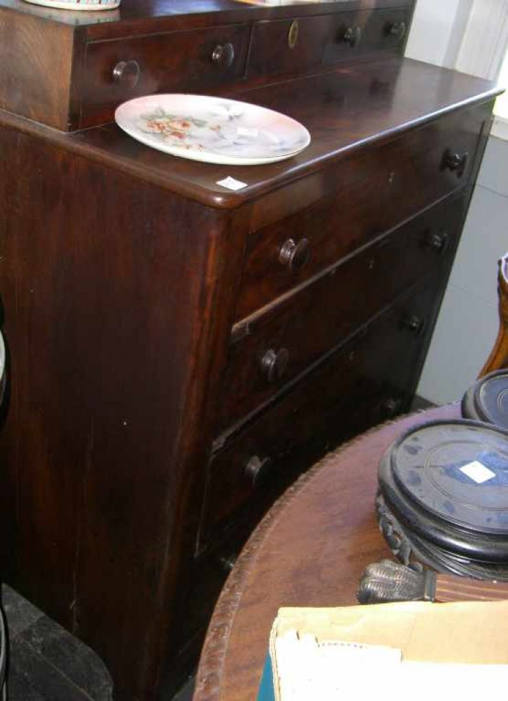Early mahogany 4 drawer chest with boxes on top and wishbone mirror. Early mahogany 4 drawer chest with boxes on top and wishbone mirror.
