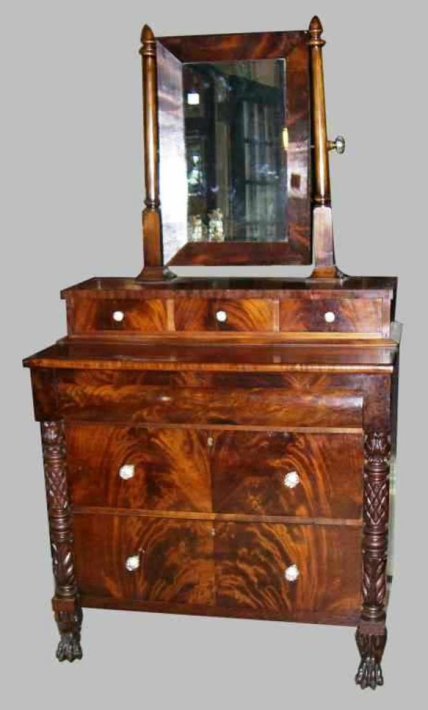 Small Empire Mahogany 6 Drawer Dresser w/Carved Column Front Support Legs, Original Glass Pulls, Column Support Adjustable Mirror - 37" wide x 20 1/4" deep x 67 1/2" tall Small Empire Mahogany 6 Drawer Dresser w/Carved Column Front Support Legs, Original Glass Pulls, Column Support Adjustable Mirror - 37" wide x 20 1/4" deep x 67 1/2" tall