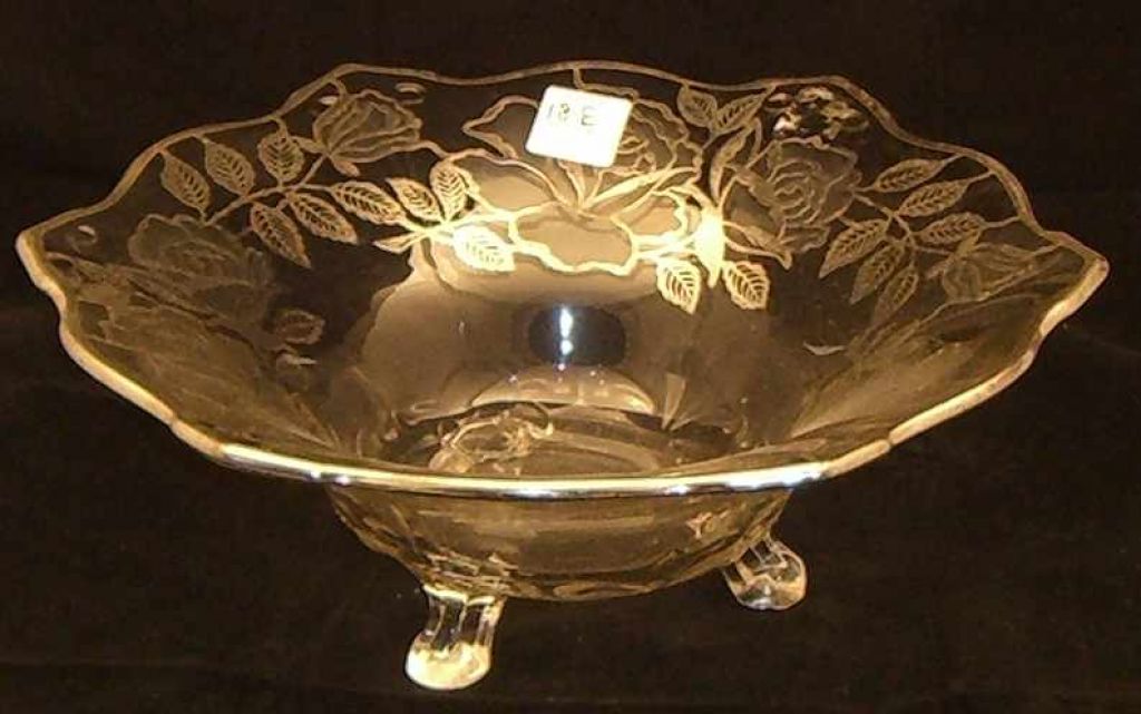 Clear 3 footed bowl with sterling silver overlaid flowers - 12" round by 4" tall Clear 3 footed bowl with sterling silver overlaid flowers - 12" round by 4" tall