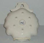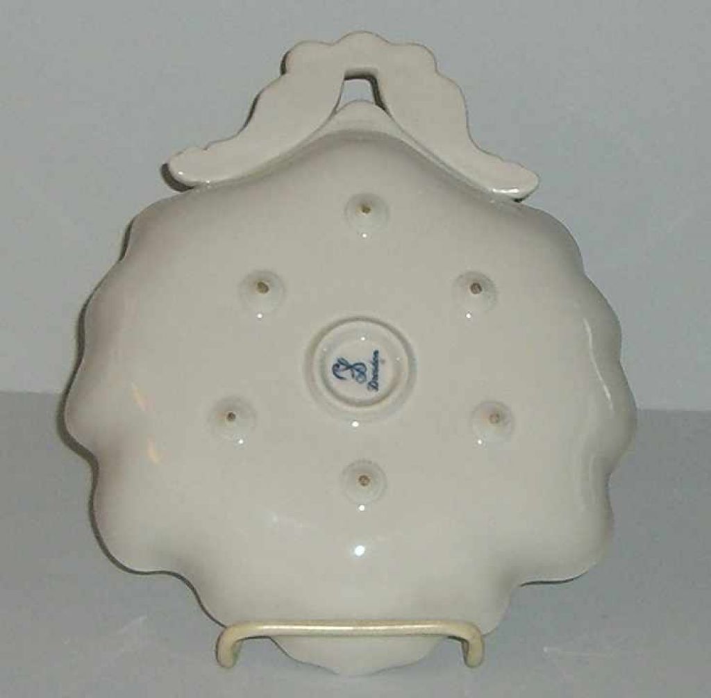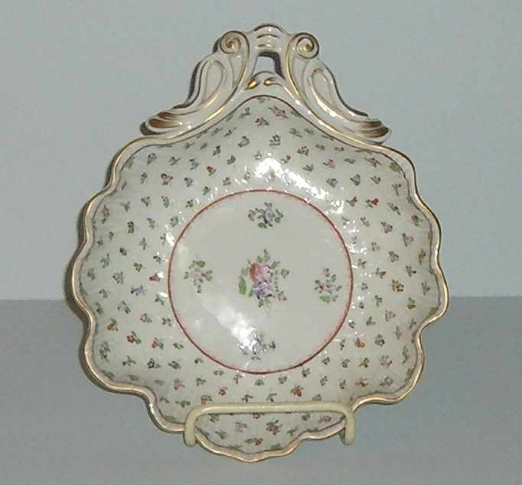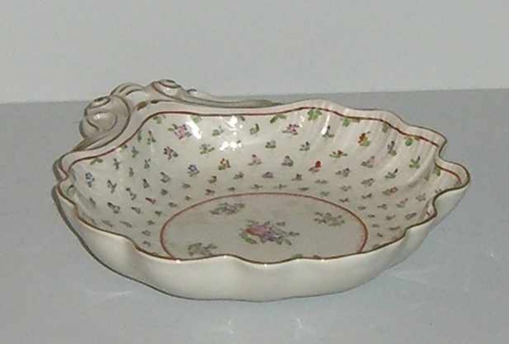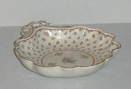 Scalloped edges Dresden handled bowl with flowers - 9 1/2" round from edge to edge of handle Scalloped edges Dresden handled bowl with flowers - 9 1/2" round from edge to edge of handle