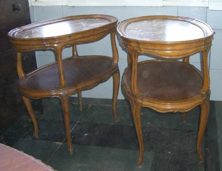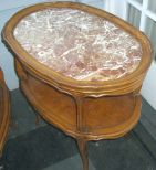 Pair of marble top two tier French provincial lamp tables - 29" tall by 30" wide by 21" deep Pair of marble top two tier French provincial lamp tables - 29" tall by 30" wide by 21" deep