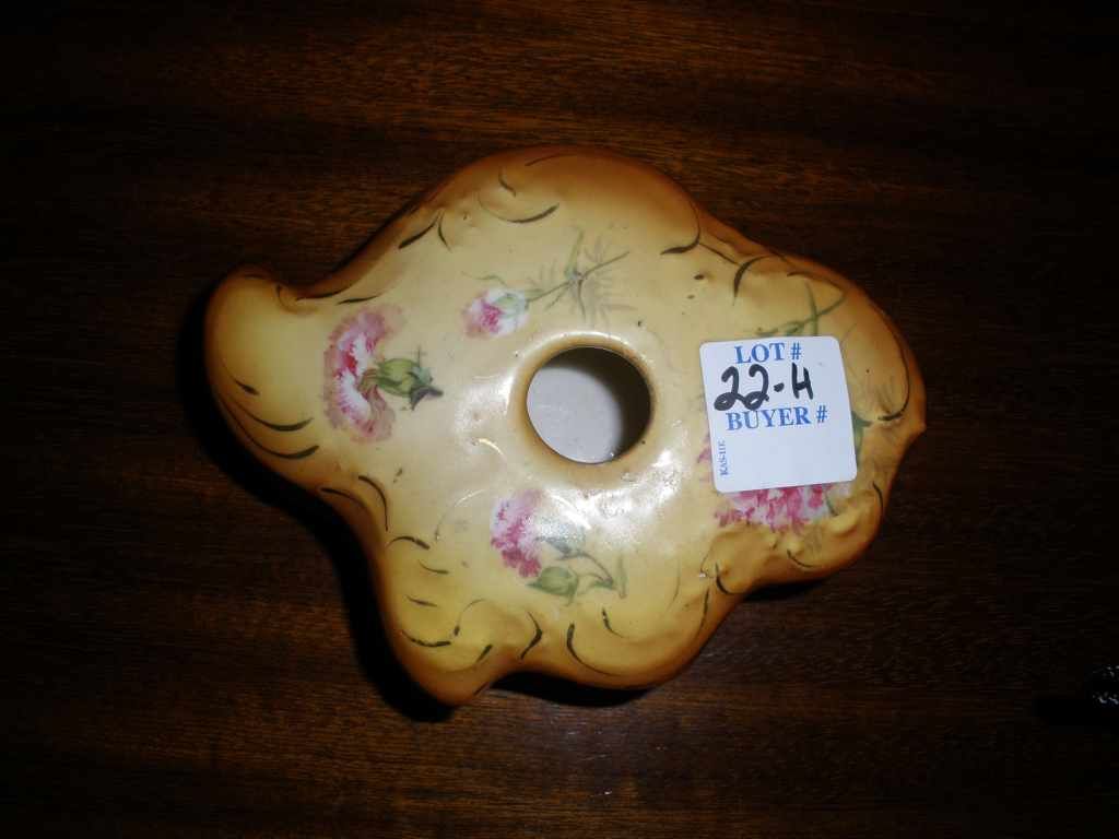 Small yellow & gold hair receiver with gold trim & pink flowers - 5" length by 4" width by 2" height Small yellow & gold hair receiver with gold trim & pink flowers - 5" length by 4" width by 2" height