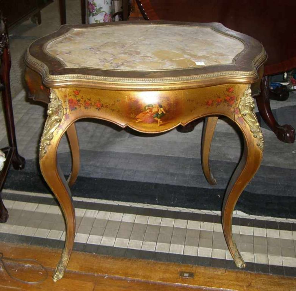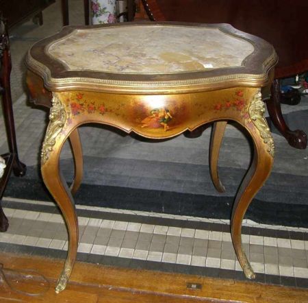 Table w/Inlaid Marble Top and Gilt Decorated Ormolu, Painted Decoration Table w/Inlaid Marble Top and Gilt Decorated Ormolu, Painted Decoration