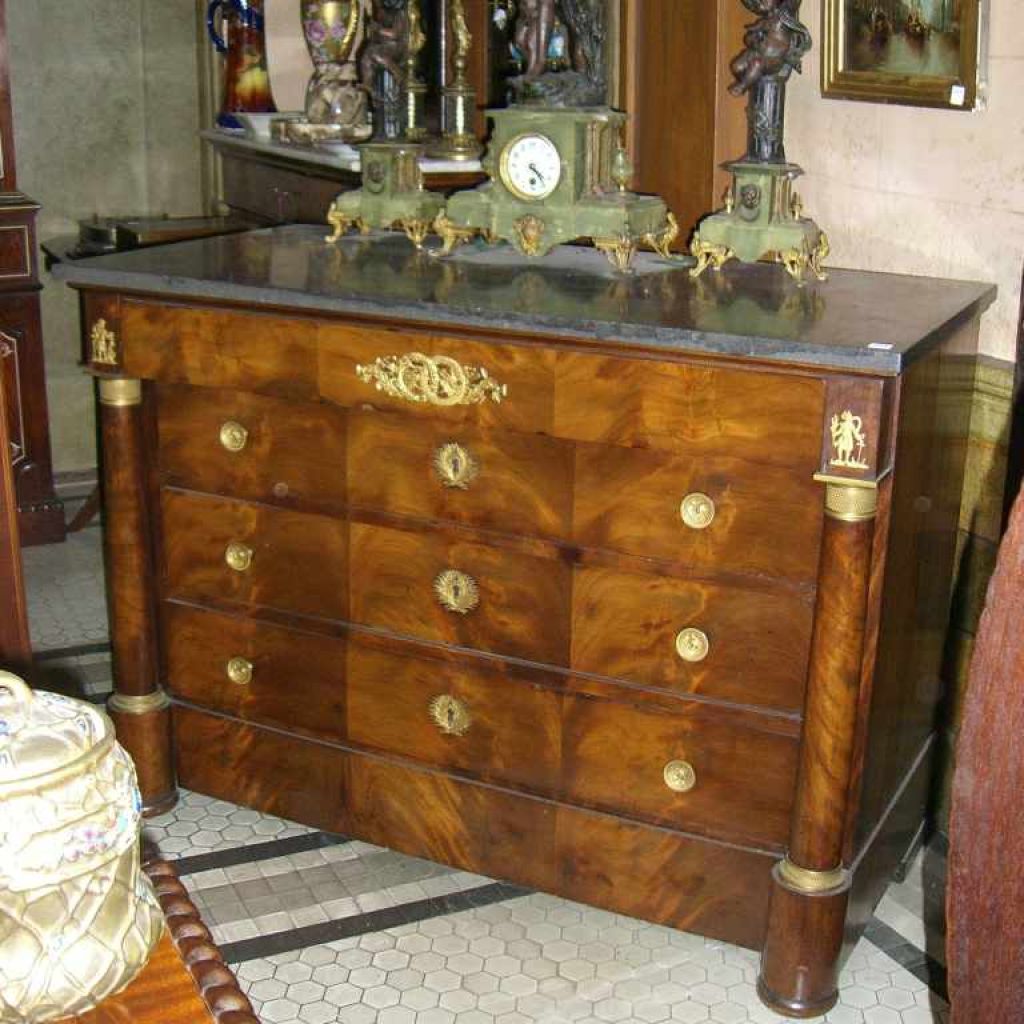 French First Empire Fruit Wood Chest of Drawers, with Gilt Bronze Ormolu Full Size Column and Black Marble Top - 49 1/2" w X 36 3/4" h X 25 1/8" d French First Empire Fruit Wood Chest of Drawers, with Gilt Bronze Ormolu Full Size Column and Black Marble Top - 49 1/2" w X 36 3/4" h X 25 1/8" d