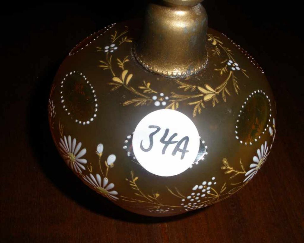 Peach colored enameled perfume bottle with flowers - 3 1/4" round by 6" tall Peach colored enameled perfume bottle with flowers - 3 1/4" round by 6" tall