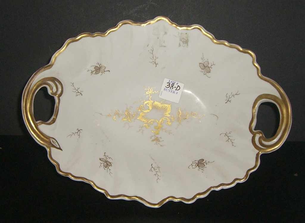 KPM oval gold & white double handle bowl - 12" length by 8 1/2" width by 2" tall KPM oval gold & white double handle bowl - 12" length by 8 1/2" width by 2" tall