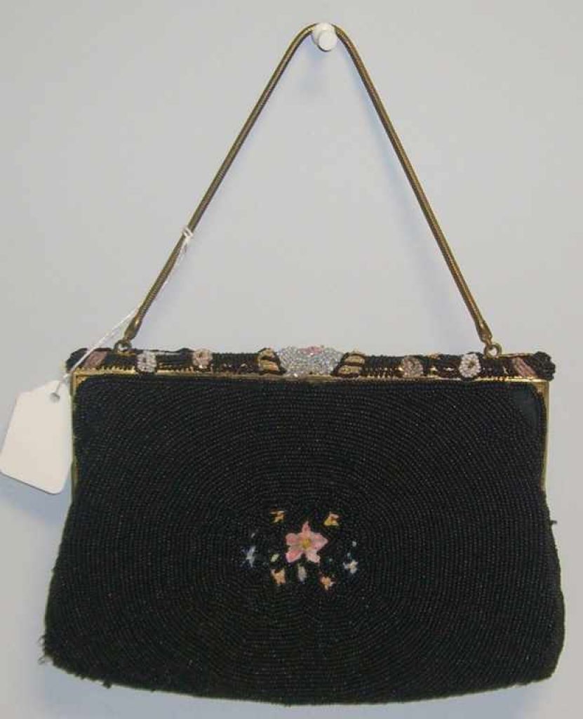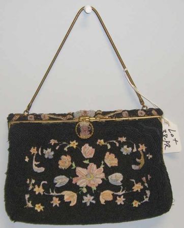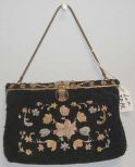 666 Black Seed Pearl Purse w/Needlework - French