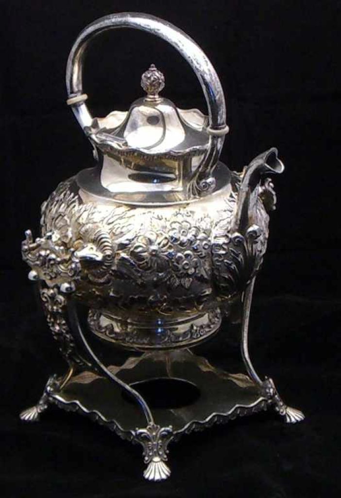 Silver plated 5 pc tea/coffee serving set - consisting of hot water kettle, coffee pot, creamer, sugar and waste - Middleton Co. Silver plated 5 pc tea/coffee serving set - consisting of hot water kettle, coffee pot, creamer, sugar and waste - Middleton Co.