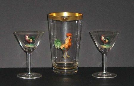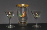 3 pcs Honesdale Decorating Co. rooster pattern gold trim Martini Set with pitcher & 2 glasses - pitcher is 3 1/4" wide by 5 1/2" tall - glasses are 2 3/4" wide by 4 1/4" tall 3 pcs Honesdale Decorating Co. rooster pattern gold trim Martini Set with pitcher & 2 glasses - pitcher is 3 1/4" wide by 5 1/2" tall - glasses are 2 3/4" wide by 4 1/4" tall