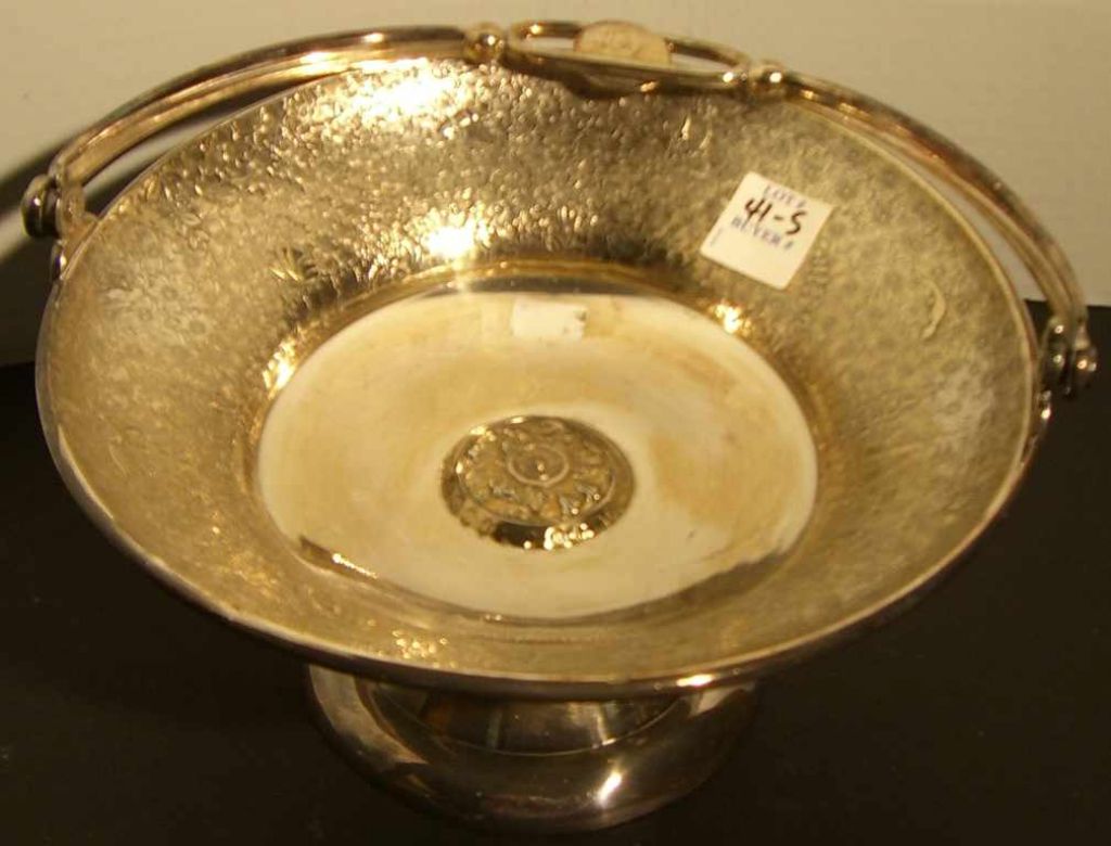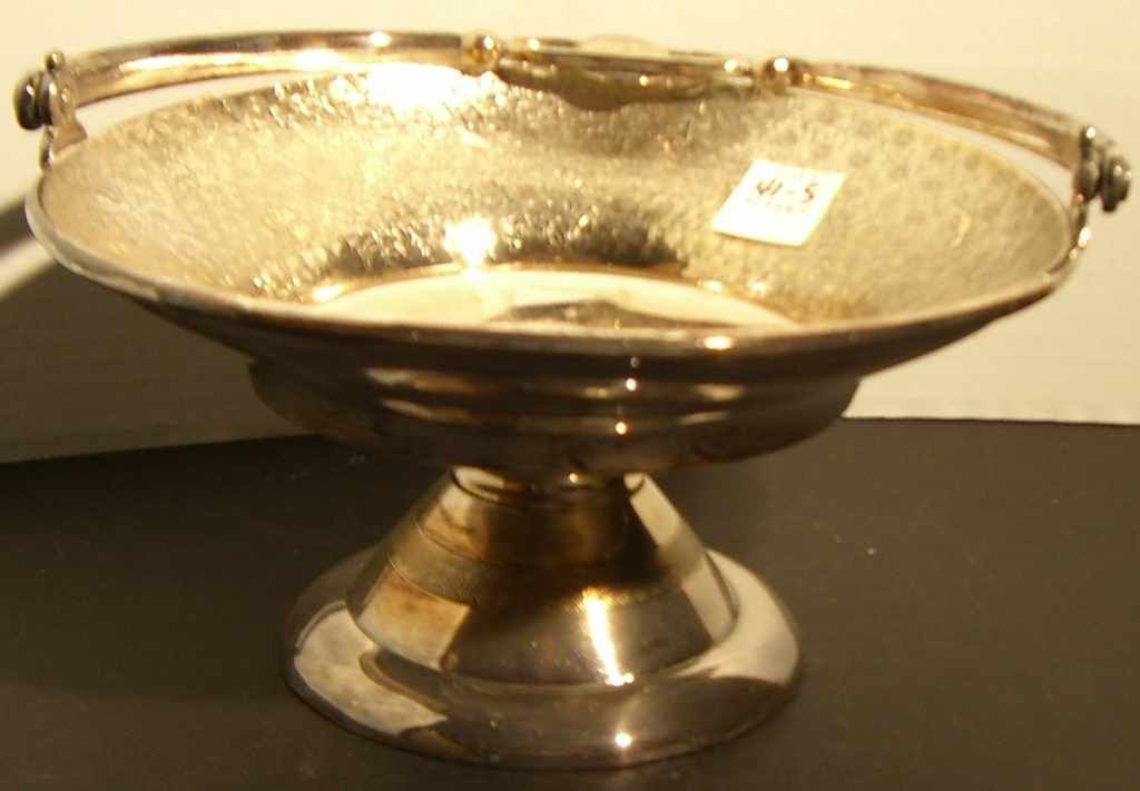 Meriden - pedestal base silver plate handled dish w/floral engraved decoration Meriden - pedestal base silver plate handled dish w/floral engraved decoration