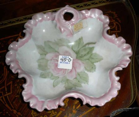 Hand painted pink flowers scalloped dish with handle - 8 1/2" length by 7" width by 2" tall Hand painted pink flowers scalloped dish with handle - 8 1/2" length by 7" width by 2" tall