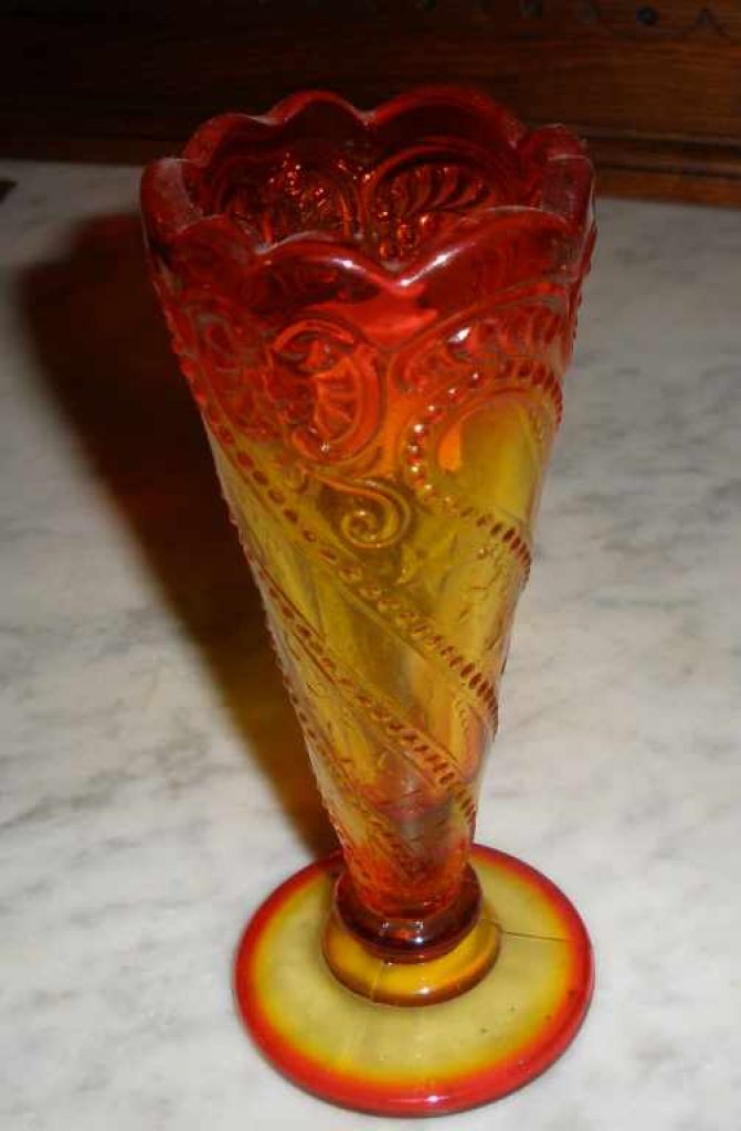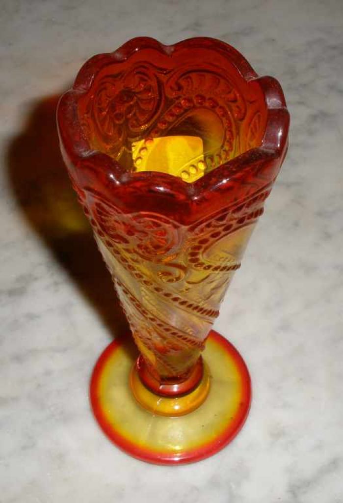 Small red & yellow bud vase with star design - 6 1/2" tall Small red & yellow bud vase with star design - 6 1/2" tall
