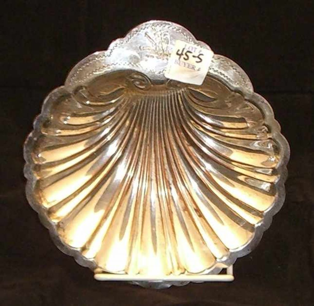Shell shaped footed silver plated nut/bon bon dish - engraving on handle - shell shaped feet Shell shaped footed silver plated nut/bon bon dish - engraving on handle - shell shaped feet