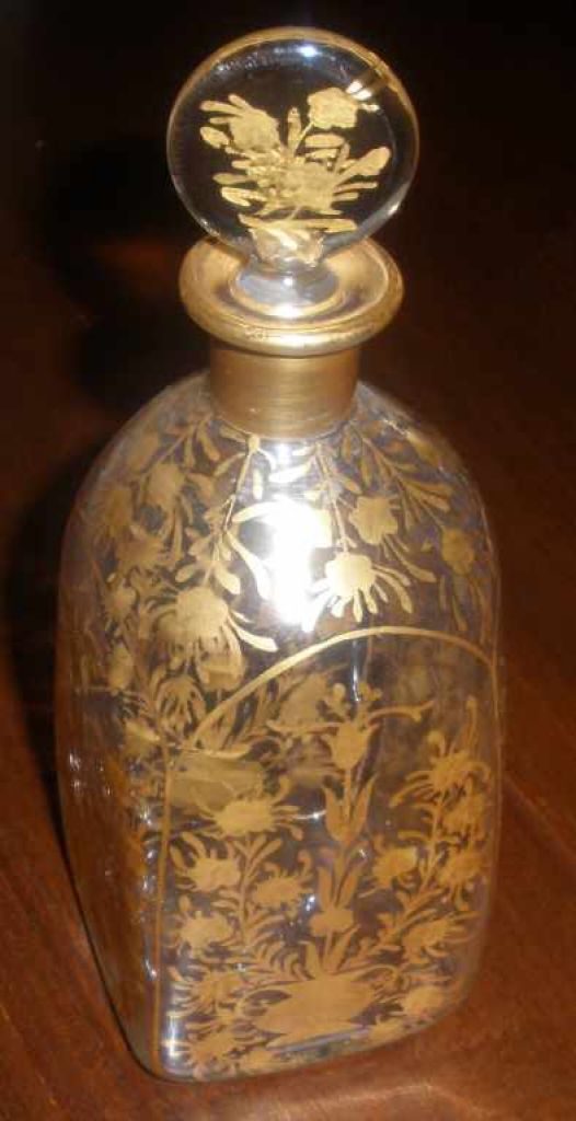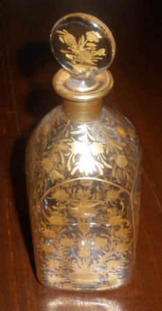 Square clear & gold flowers perfume bottle - 2 1/2" square by 7" tall Square clear & gold flowers perfume bottle - 2 1/2" square by 7" tall