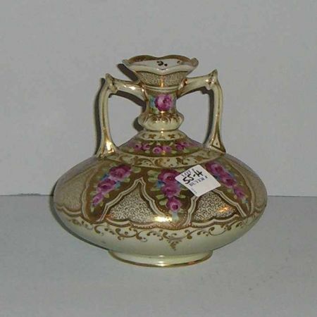 Double handle short vase with gold trim & pink flowers - 6" round by 6" tall Double handle short vase with gold trim & pink flowers - 6" round by 6" tall