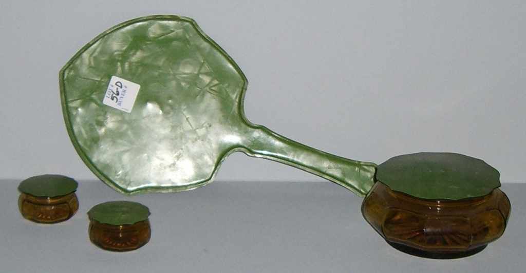 4 pc. green and black dresser set. Hand mirror, powder box and 2 ring boxes. 4 pc. green and black dresser set. Hand mirror, powder box and 2 ring boxes.