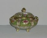 889 Nippon 3 handled covered dish with pink flowers & gold trim