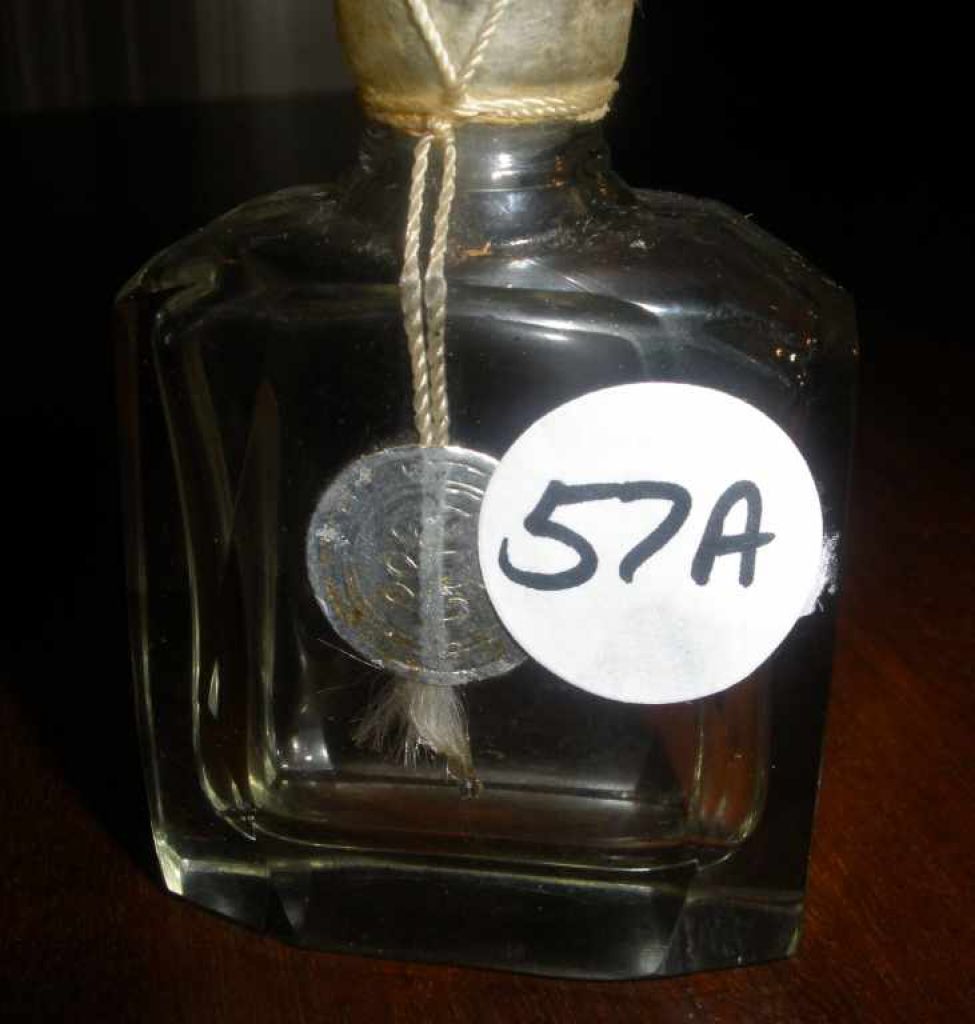 Small clear perfume bottle with string around stopper - 1 3/4" by 3/4" by 3" Small clear perfume bottle with string around stopper - 1 3/4" by 3/4" by 3"
