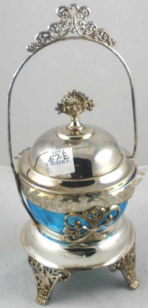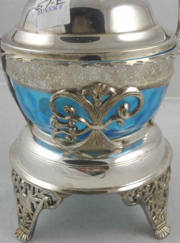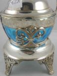 Victorian frosted blue sugar bowl in silver holder. 5" round x 12" tall Victorian frosted blue sugar bowl in silver holder. 5" round x 12" tall