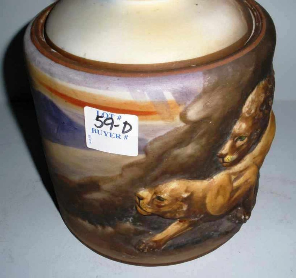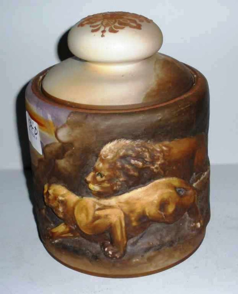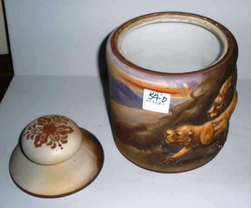 Nippon hand painted raised lion scene humidor. Nippon mark - 5 1/2" round by 7" tall Nippon hand painted raised lion scene humidor. Nippon mark - 5 1/2" round by 7" tall