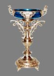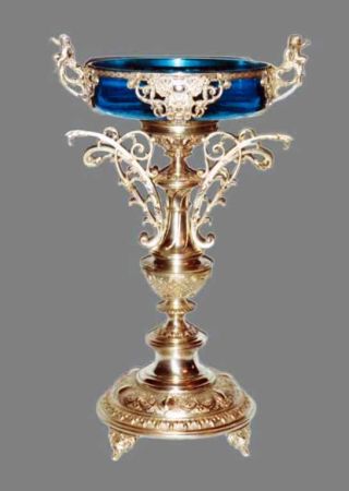 Large silver plated centerpiece w/cherubs and sapphire glass insert bowl - 24" tall x 11" diameter Large silver plated centerpiece w/cherubs and sapphire glass insert bowl - 24" tall x 11" diameter
