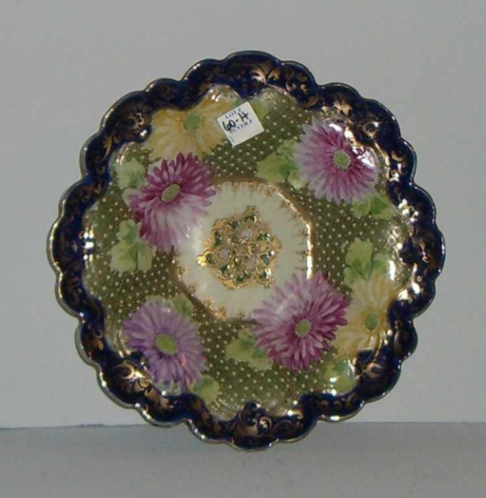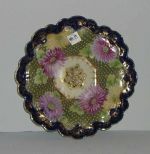 Blue & gold bowl with yellow, pink, & purple flowers white beading - 11" round Blue & gold bowl with yellow, pink, & purple flowers white beading - 11" round