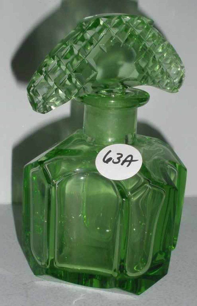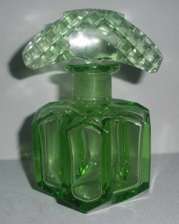 Green depression perfume bottle with fan shaped stopper - 2 3/4" by 4 1/2" Green depression perfume bottle with fan shaped stopper - 2 3/4" by 4 1/2"