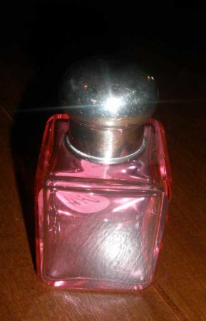 Pink square perfume bottle with silver top - 1 3/4" by 3" Pink square perfume bottle with silver top - 1 3/4" by 3"