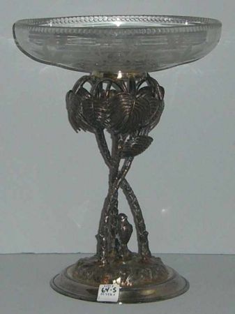Silver plated epergne bird and palm tree supports w/glass bowl with palm tree and bird engraving Silver plated epergne bird and palm tree supports w/glass bowl with palm tree and bird engraving