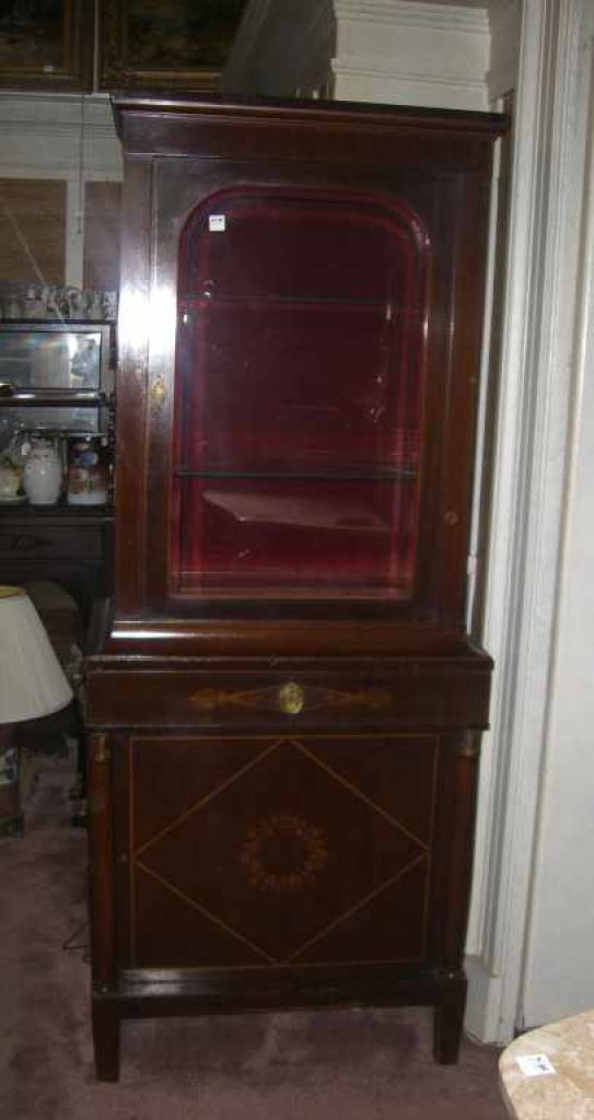 French Empire style display cabinet with inlay and music cabinet base. 29" length x 18" deep x 72" height French Empire style display cabinet with inlay and music cabinet base. 29" length x 18" deep x 72" height