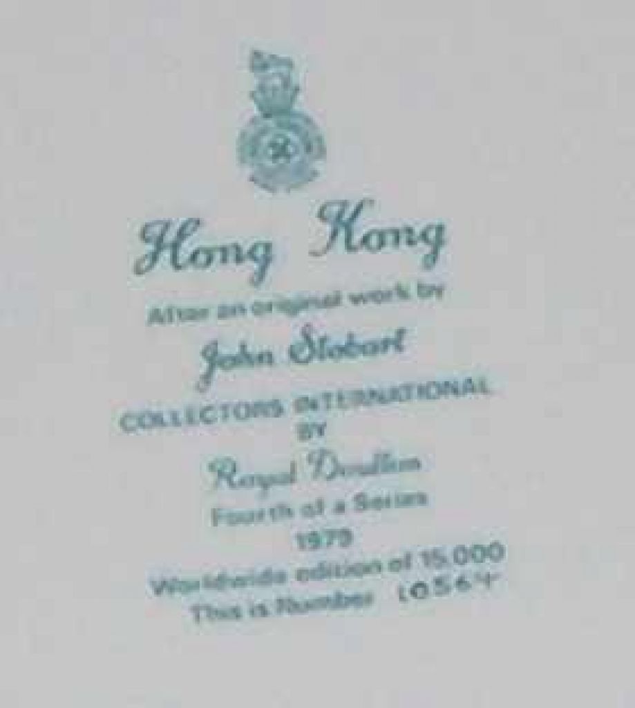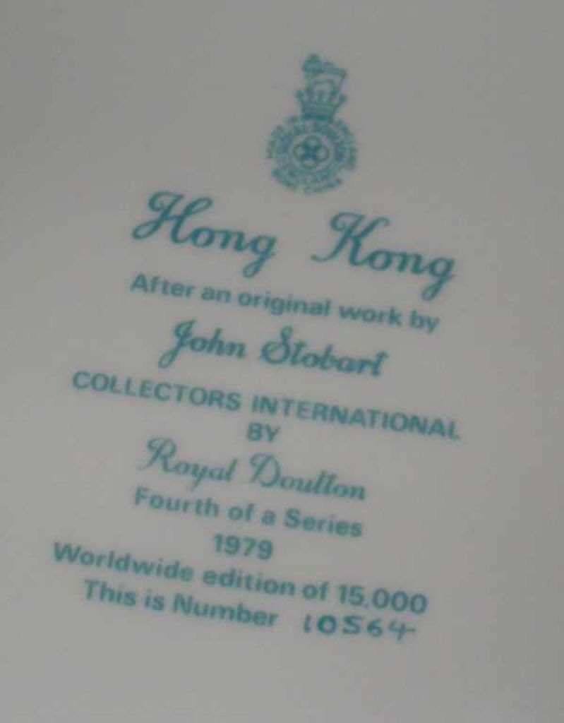 Royal Doulton plate of sailing boats signed by Stobart - 10 1/2" round. "Hong Kong" collector plate 4th in series 1979. Royal Doulton plate of sailing boats signed by Stobart - 10 1/2" round. "Hong Kong" collector plate 4th in series 1979.
