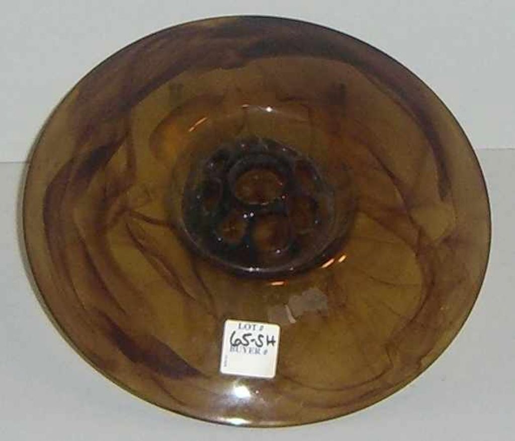 Brown swirl console bowl with glass flower frog in center - 9" round Brown swirl console bowl with glass flower frog in center - 9" round