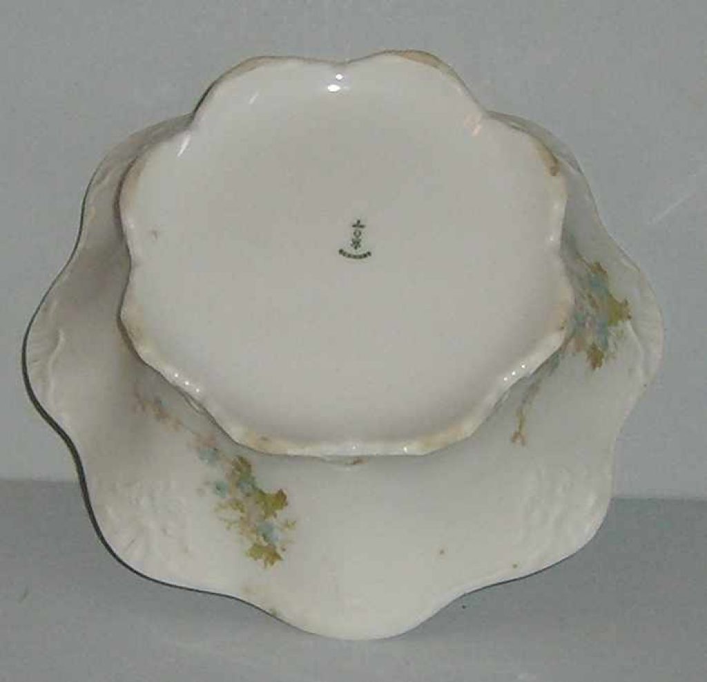 German small gold trimmed ruffled rim bowl with small blue flowers - 7" round by 3" tall German small gold trimmed ruffled rim bowl with small blue flowers - 7" round by 3" tall